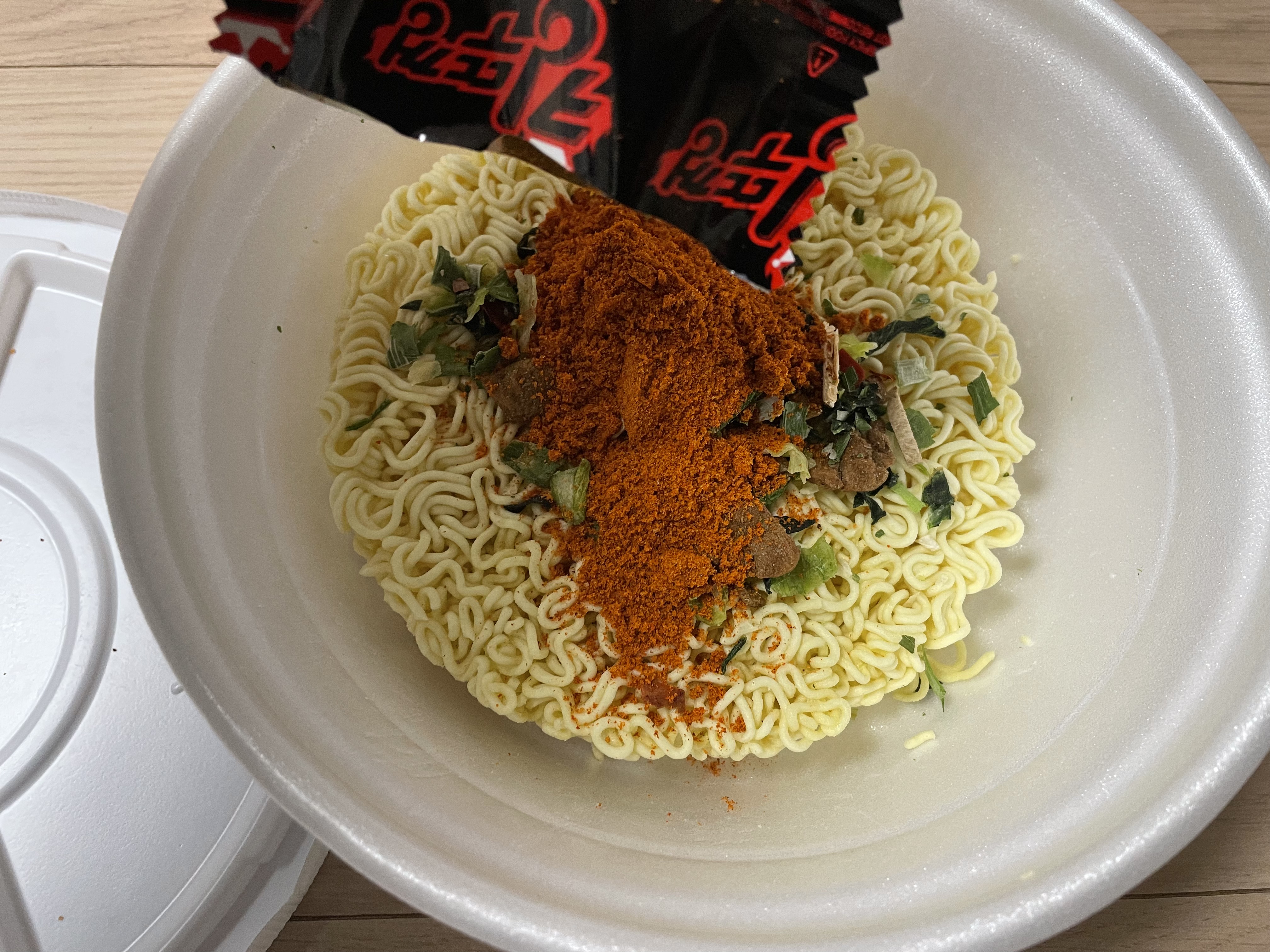뚜껑을 열고 면 위에 분말스프, 건더기스프를 넣고