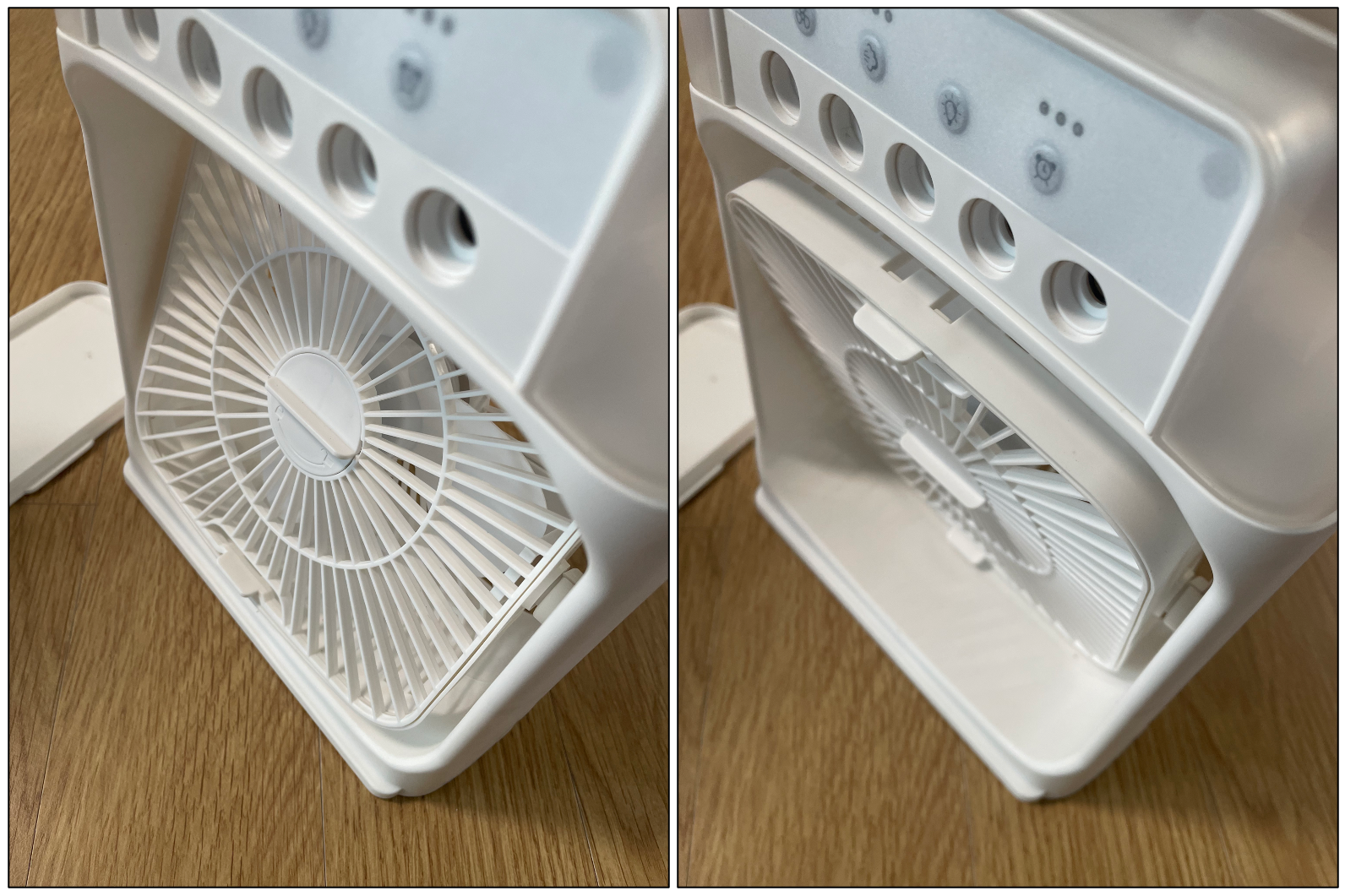 선풍기 팬 위에 가습기가 위치해 있어,