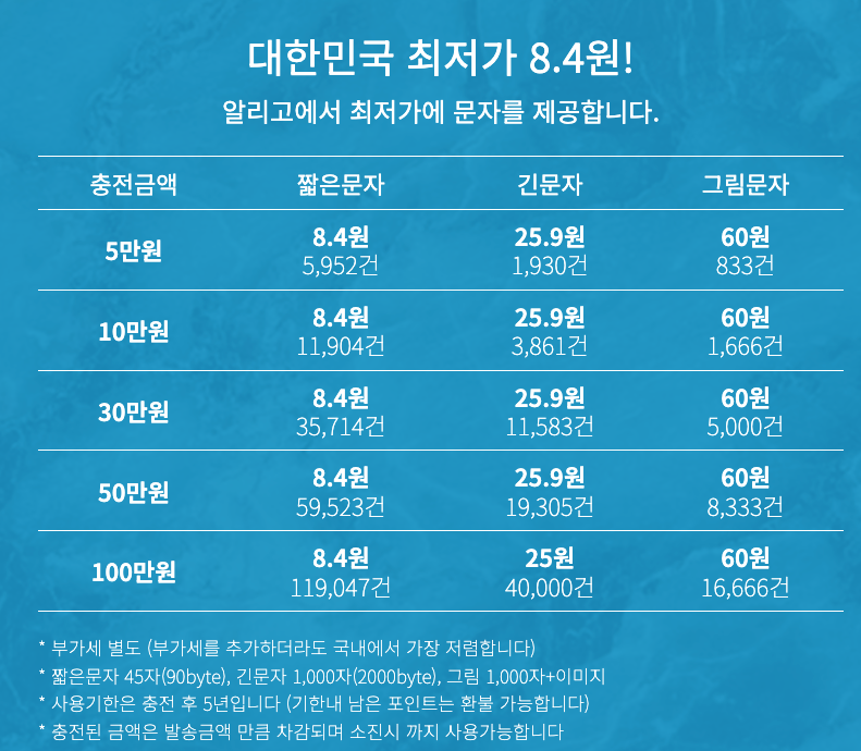 알리고 - 국내 최저가 문자발송 알리고 문자, 단문8.4원 장문25원 그림60원 알리고 대량문자/단체문자/문자사이트/문자발송