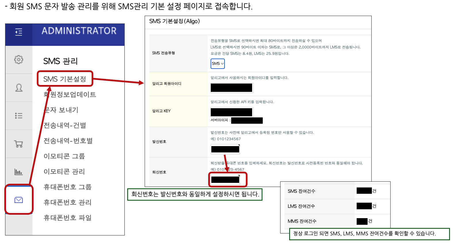3. SMS 관리자에서 발신번호와 발송 잔여 건수 관리