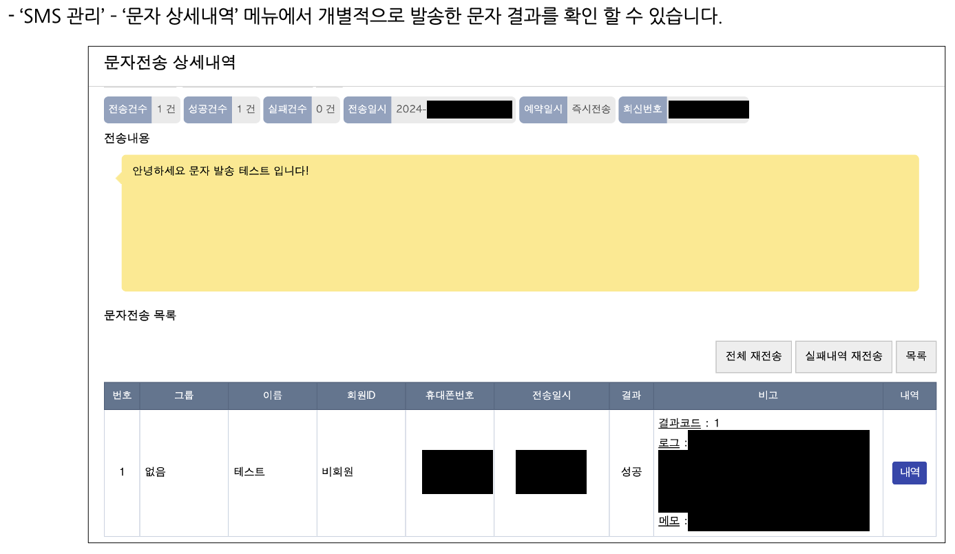 발송된 문자 메시지의 상세 내역을 확인할 수 있어,