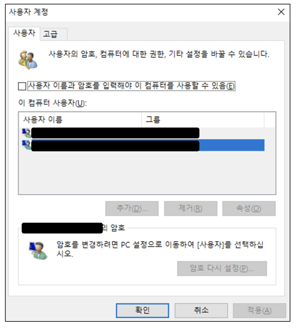 netplwiz- 사용자 계정 창에서 자동 로그인할 사용자 계정을 선택